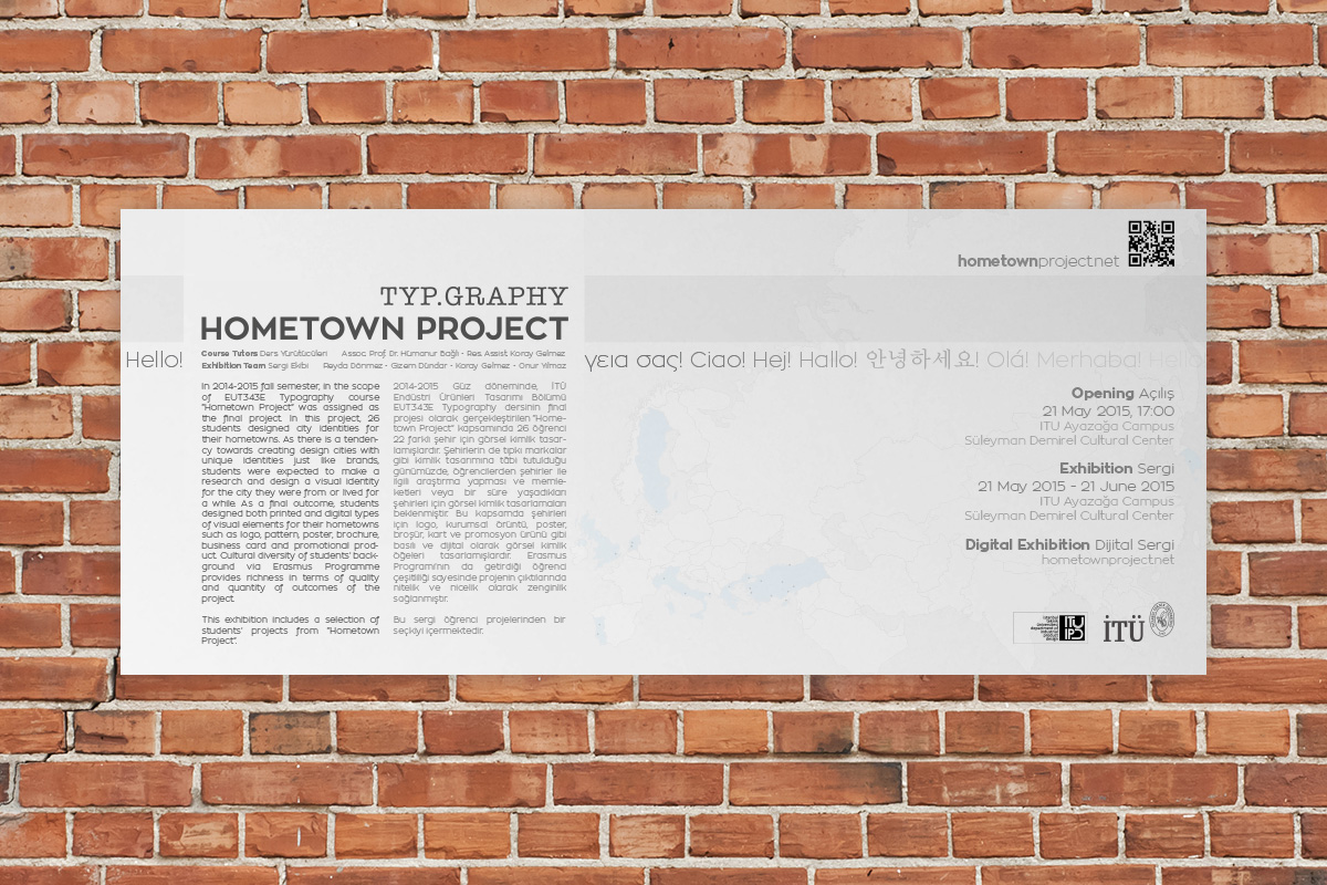 In 2014-2015 fall semester, in the scope of EUT343E Typography course “Hometown Project” was assigned as the final project. In this project, 26 students designed city identities for their hometowns. As there is a tendency towards creating design cities with unique identities just like brands, students were expected to make a research and design a visual identity for the city they were from or lived for a while. As a final outcome, students designed both printed and digital types of visual elements for their hometowns such as logo, pattern, poster, brochure, business card and promotional product. Cultural diversity of students’ background via Erasmus Programme provides richness in terms of quality and quantity of outcomes of the project.