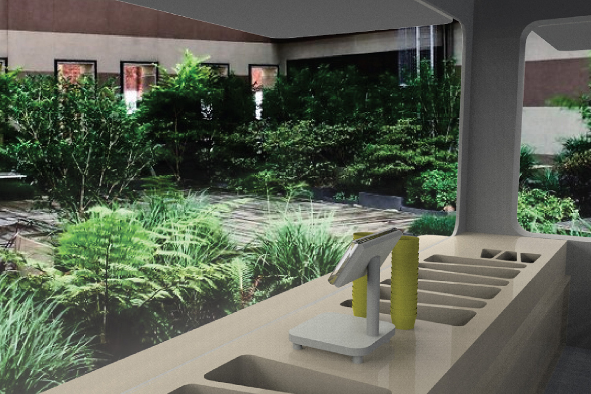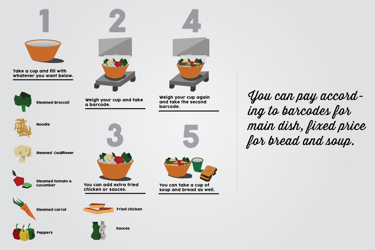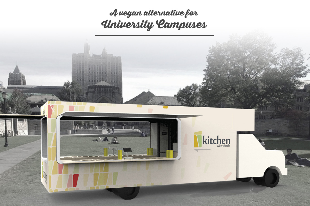 Kitchen with wheels focuses on steamed vegetables, and considers different food needs of university students. It allows users to apply their own recipes by mixing different kinds of vegetables and sauces.