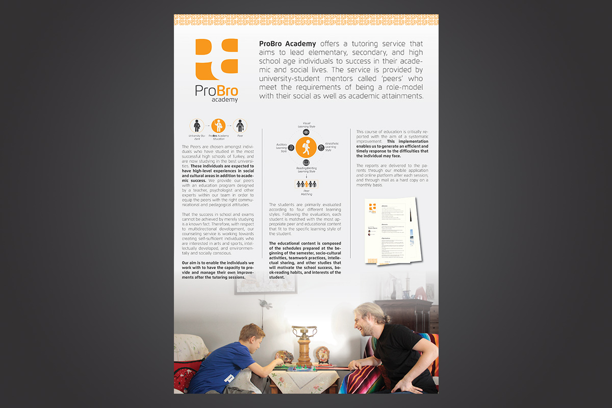 Corporate identity and the materials developed upon ProBro Academy's vision which multidimensional development of young people and main sensitivenesses of the target group. Since 2015, apart from corporate identity; photography, copywriting, various presentations, social media visuals, flyers and promotional projects have been provided.