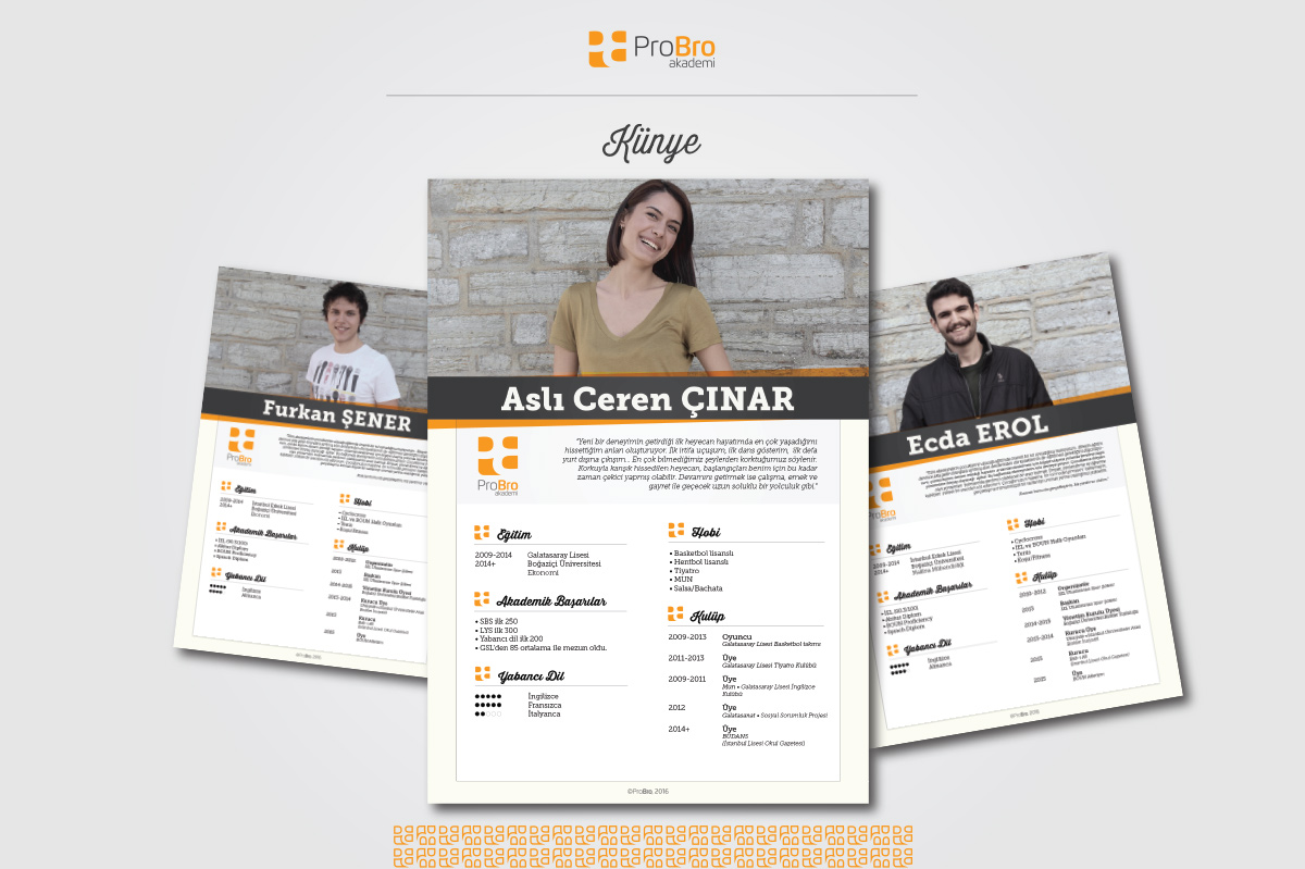 Corporate identity and the materials developed upon ProBro Academy's vision which multidimensional development of young people and main sensitivenesses of the target group. Since 2015, apart from corporate identity; photography, copywriting, various presentations, social media visuals, flyers and promotional projects have been provided.
