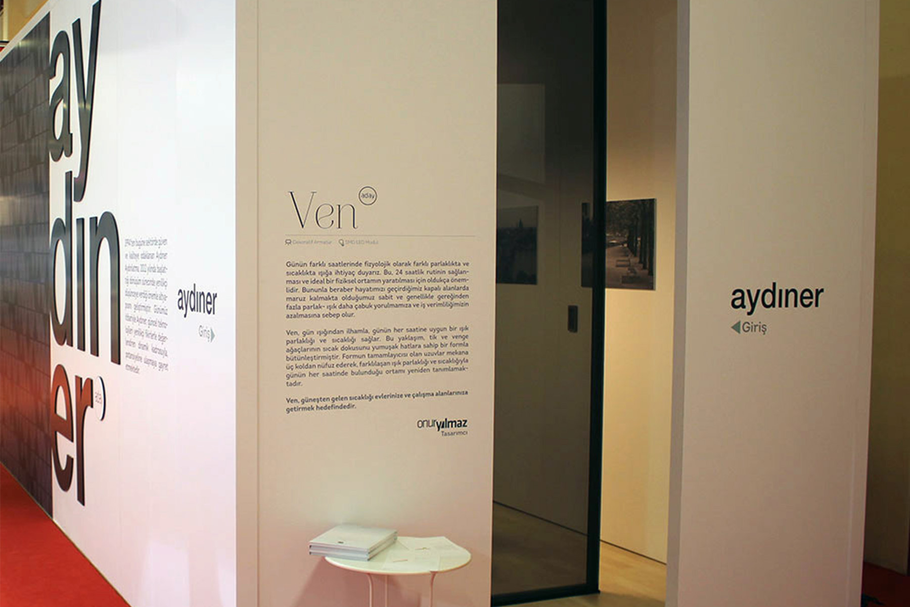 Stand design of Aydiner Lighting is built as a speculative modern art exhibition to provoke a mystery among visitors. In the entrance room, an office created to let visitors experience Ven with a real environment.
